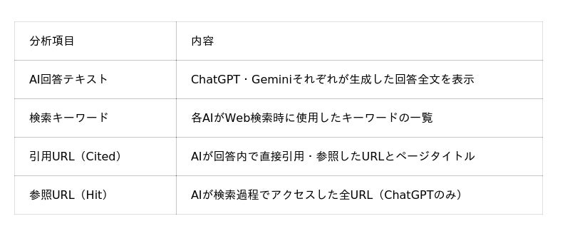 AI検索エンジンの回答をサイドバイサイドで比較: ChatGPTとGoogle Geminiが同じ質問に対してどのような回答を生成するかを、並べて比較表示。AIごとの回答の違いや情報ソースの偏りを一目で把握できます。