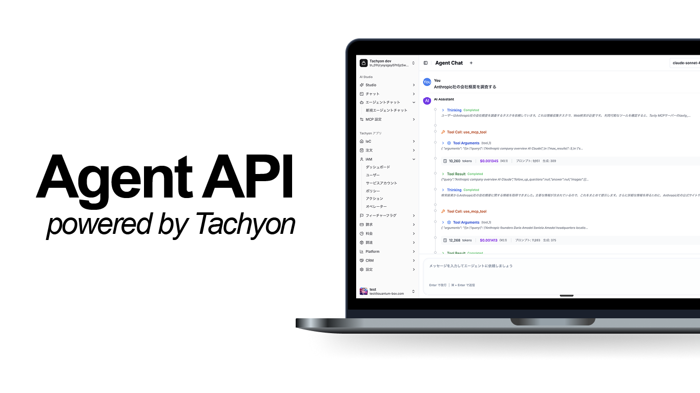 Tachyon Agent APIはこのMCPに完全準拠しており、高い相互運用性と安全なデータ連携を実現します。今後はMCPエコシステムとの連携を拡大し、社内外のさまざまなツールやサービスとシームレスに接続することで、企業の情報活用を向上させます。