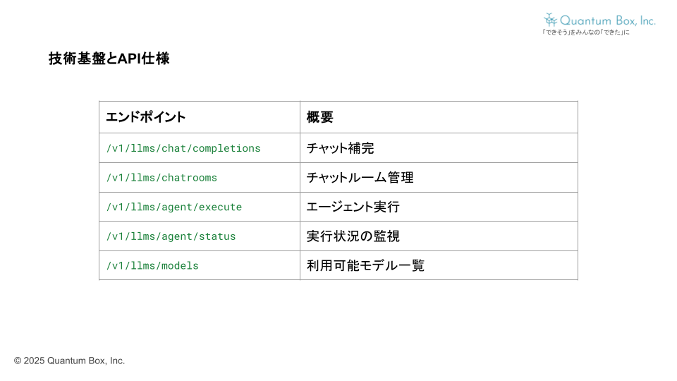 生成AIの普及により、単発の推論や文章生成を行うAPIは数多く登場しています。しかし、従来のAI APIは特定のタスクへの応答に留まり、長期的な目標達成や継続的な改善を自律的に行うことができませんでした。Quantum Boxでは「テクノロジーをみんなのものに」というビジョンのもと、業務効率化や人手不足の解消を目指して、実際に使える自律型AIエージェントの基盤を開発しました。