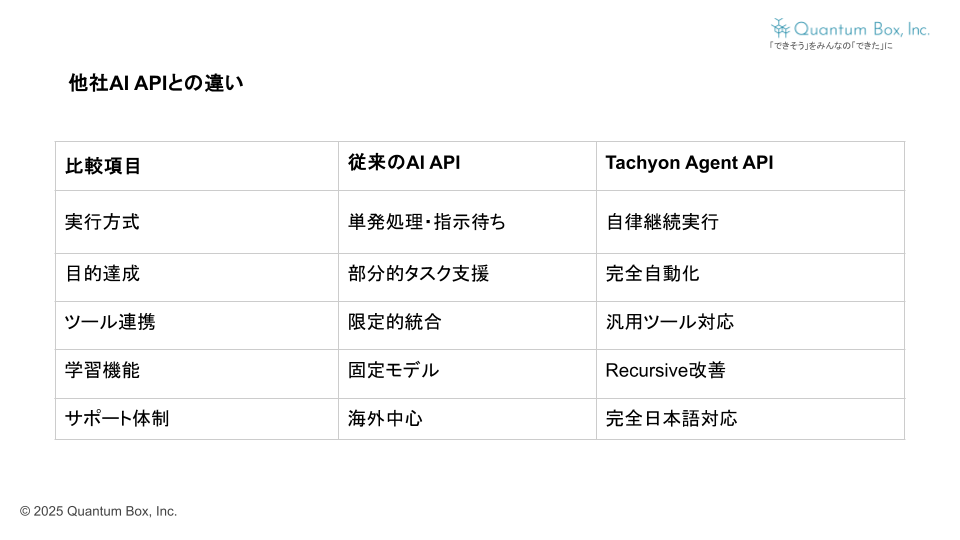 Quantum Box株式会社(本社:東京都渋谷区、代表取締役:福山貴徳)は、Model Context Protocol(MCP)に完全対応した自律型AIエージェント開発プラットフォーム「Tachyon Agent API」を正式に公開しました。本サービスはAIエージェントが自ら考え、学習し、設定されたゴールを達成するまでタスクを継続的に実行するもので、複雑なビジネスプロセスを完全自動化する新世代のAPIです。
