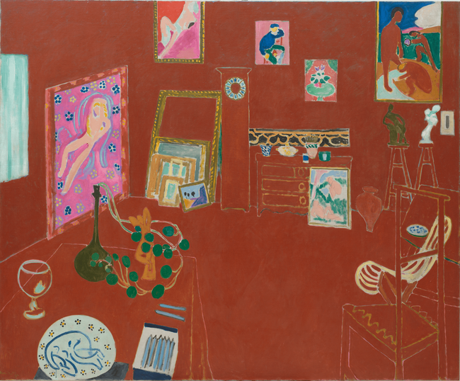マティスの《赤いアトリエ》は、イッシー・レ・ムリノーの町でアーティストの仕事場を描いています。《赤いアトリエ》は、マティスの最も忠実で勇敢な初期のパトロンであったセルゲイ・シチューキンからの依頼に応じて制作された作品の一部として描かれました。シチューキンはこの絵の前身である《ピンクのアトリエ》を好んで購入しましたが、《赤いアトリエ》の購入は辞退しました。この絵画は16年間マティスの手の元に残り、その間、1912年にロンドンで開催された第2回ポスト印象派展や、1913年のアーモリーショーのため、ニューヨーク、シカゴ、ボストンを巡回しました。