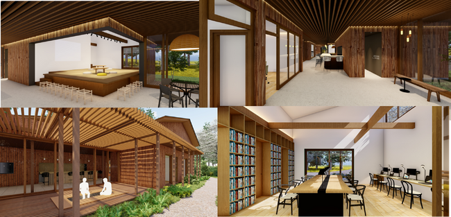 新事務所の内装イメージ(多目的室、エントランス、足湯、執務室)