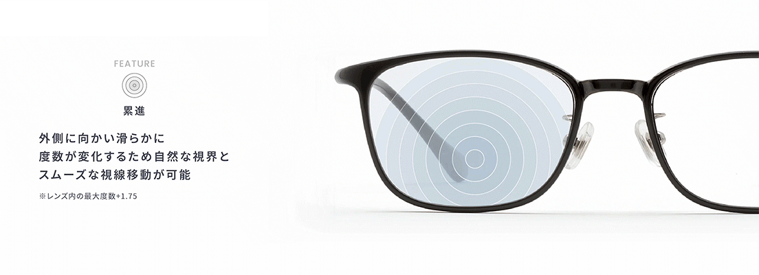 レンズ中心よりやや下部の、手元を見る時の目線の位置に最も強い度数(+1.75D)を配置し、周辺に向かって徐々に度数を下げるグラデーション構造になった【累進多焦点レンズ】を採用。境界線がないため視界の歪みが少なく、スマホ操作からデスクワーク、対面の会話まで、眼鏡を掛けたままシームレスに使用可能です。