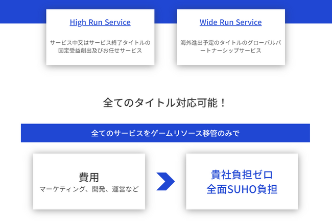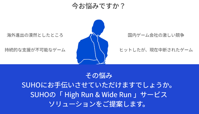 株式会社スホ(本社:東京都新宿区、代表取締役社長:田 昌錫)は、企業様がお持ちのゲーム開発・運営に対する様々なお悩みを解決するため、『High Run&Wide Run』ゲーム開発・運営サービスを開始したことをお知らせいたします。