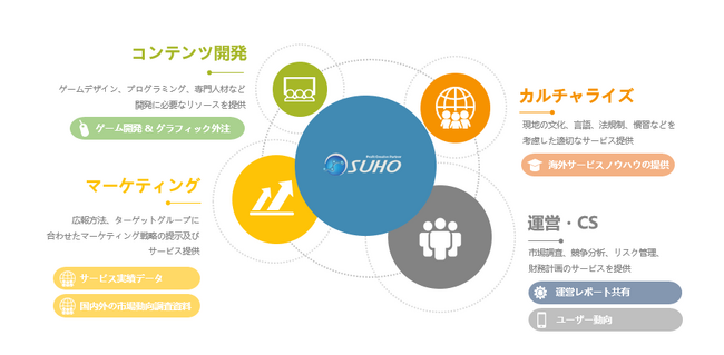 ゲーム開発、グラフィック外注などの「コンテンツ開発」、ターゲットに合わせた宣伝方法の提案などの「マーケティング」、市場調査、競合分析、リスク管理などの「運営・CS」、海外展開に欠かせない現地の文化、言語、法規制などを反映させる「ローカライズ」等のサービスを用意しております。