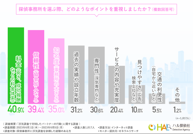 「探偵事務所を選ぶ際、どのようなポイントを重視しましたか?(複数回答可)」と質問したところ、『料金(安さ、成功報酬などの料金体系)(40.9%)』と回答した方が最も多く、次いで『信頼性(協会加入など)(39.4%)』『知名度(事務所の大きさ)(35.0%)』と続きました。