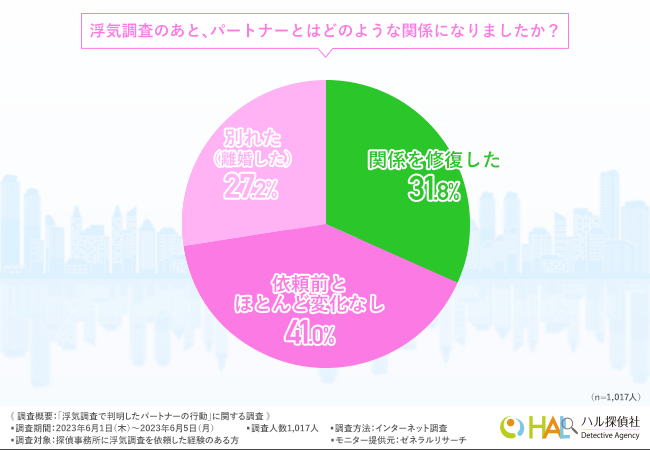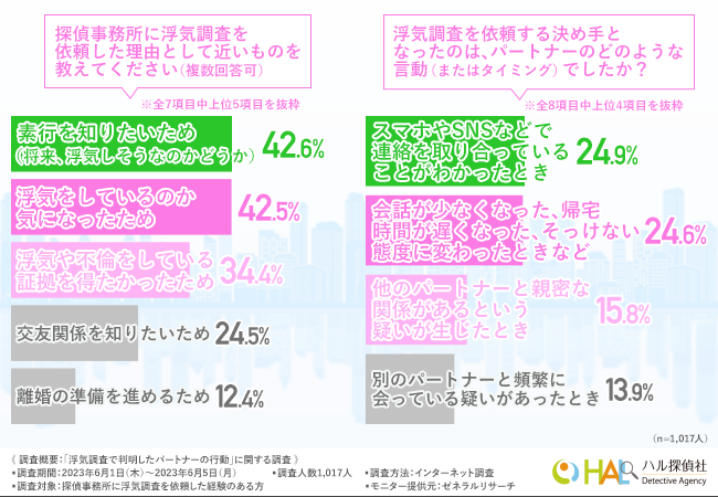 株式会社HAL(本店所在地:東京都新宿区、代表取締役:浅見 俊祐)は、探偵事務所に浮気調査を依頼した経験のある方を対象に、「浮気調査で判明したパートナーの行動」に関する調査を実施しました。