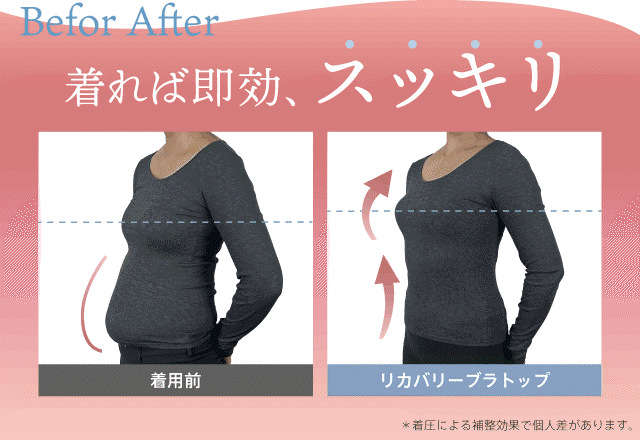 healogyリカバリ―ブラトップは、着圧により姿勢を改善することで、バスト・お腹・背中のラインが瞬時にスッキリして見えるのもメリットです。