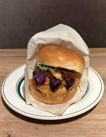 京都錦市場の西出口高倉通から北に上がったところにある「ミセスリンダのフライドチキン」。ビブグルマン5年連続獲得のセクションドール永松シェフ監修のクラフトフライドチキンは、胸焼けせずにしっとりジューシーとリピーター続出、海外のお客様にもGoogle評価の高いお店です。7月よりスタートした月替りバーガー。得意の野菜やオリジナルソースを使った月替りバーガーの9月は「麻婆なすバーガー」