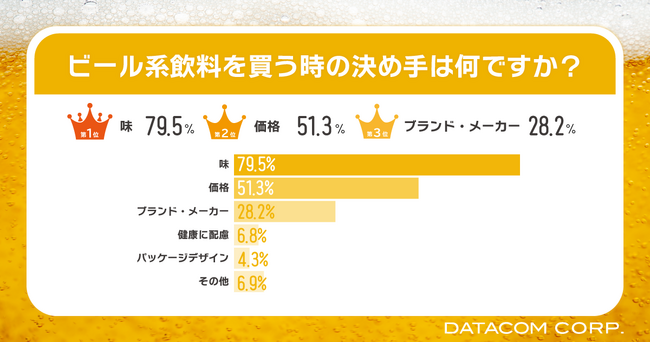 月1回以上ビール系飲料を飲むと答えた人を対象に「ビール系飲料を買う時の決め手は何ですか?(複数回答可)」という質問に対して、1位「味」が79.5%、2位「価格」51.3%、3位「ブランド・メーカー」28.2%という結果になりました。中高年〜シニア層はビールを購入する際に味を重視しており、価格やブランドといった要素が購買に与える影響は味と比較すると小さいことが分かりました。また、昨今健康意識が高まりつつありますが、ビールの購入においてはあまり意識していないようです。