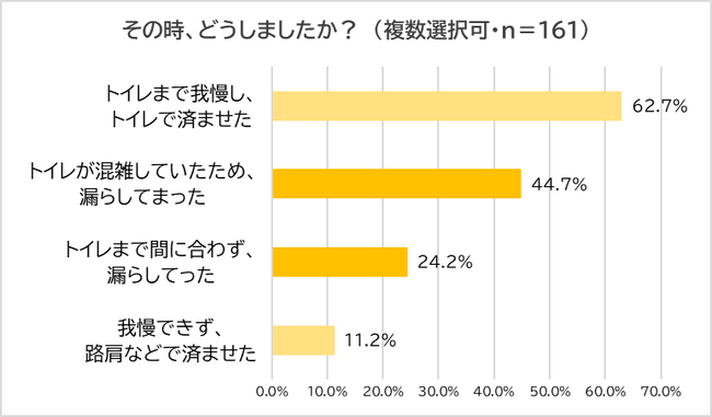 トイレに行けない状況下で便意をもよおすことが「よくある」「時々ある」「あまりない」と回答した161人に「その時、どうしたか?」尋ねました。「トイレまで我慢し、トイレで済ませた」(62.7%)が最多でしたが、「トイレが混雑していたため、漏らしてしまった」(44.7%)、「トイレまで間に合わず、漏らしてしまった」(24.2%)など漏らしてしまった方も6割弱(56.5%)いました。また、「我慢できず、路肩などで済ませた」も1割超(11.2%)いました。