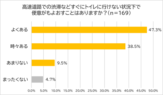 「高速道路で渋滞などすぐにトイレに行けない状況下で便意がもよおすことはあるか?」と尋ねたところ、「よくある」(47.3%)、「時々ある」(38.5%)、「あまりない」(9.5%)、「まったくない」(4.7%)となりました。IBDやIBSの患者さんは、物理的にトイレに行けないという不安やストレスでより発症しやすくなるため、9割弱(85.8%)の方がつらい経験をしていることがわかります。