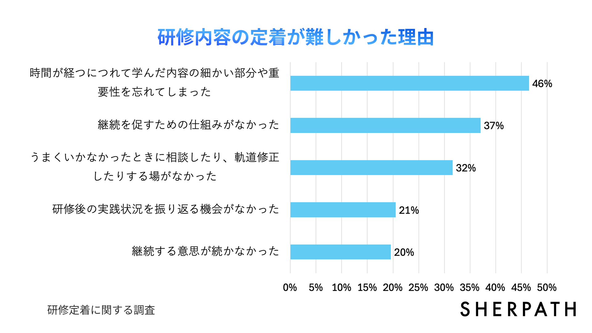 ・研修内容の定着における課題は「時間が経つにつれて学んだ内容の細かい部分や重要性を忘れてしまった」がもっとも多い