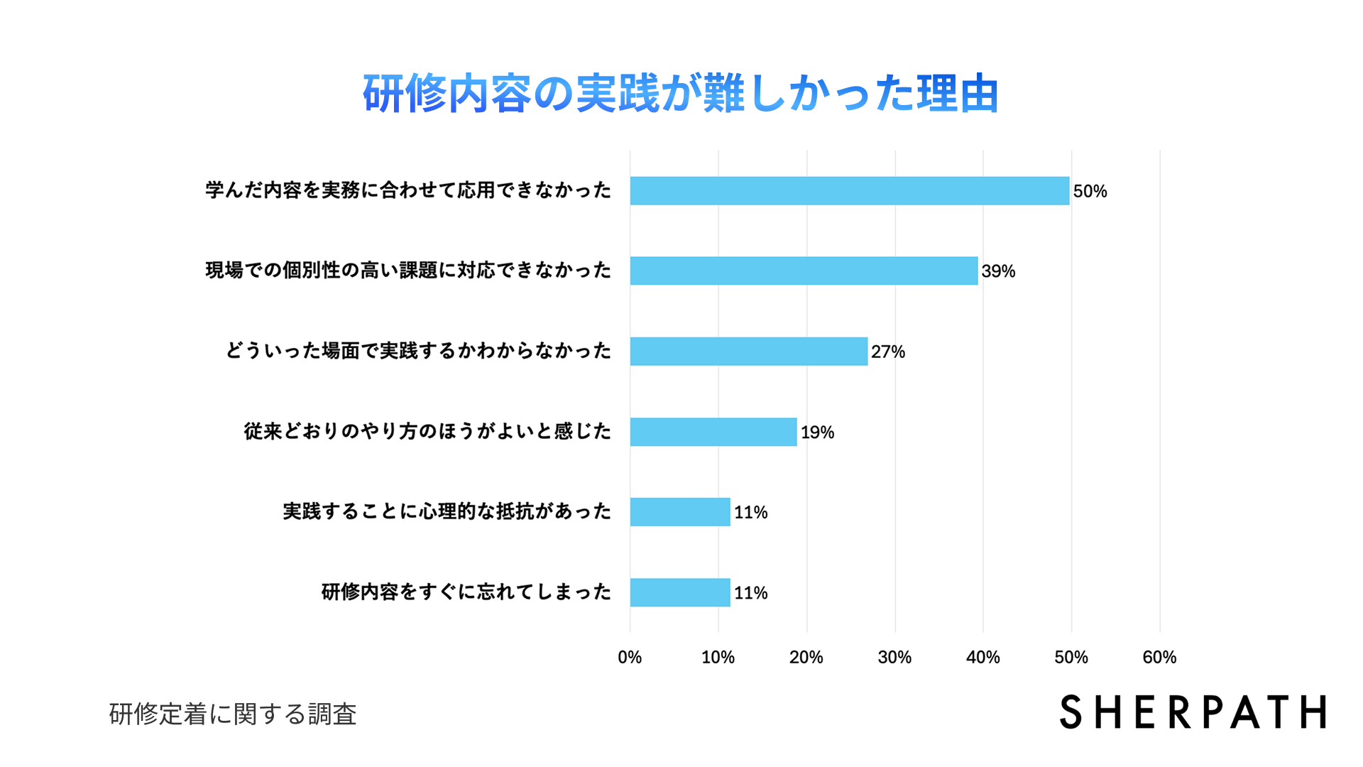 研修内容の実践が難しい理由として「学んだ内容を実務に合わせて応用できなかった」「現場での個別性の高い課題に対応できなかった」の回答が多く、実践することができた理由としては「実践する際にすぐに聞ける人がいた」「社内の同僚や上司が実践のサポートをしてくれた」などが上位となり、「研修の実践をサポートしてくれる存在」の重要性が伺える。