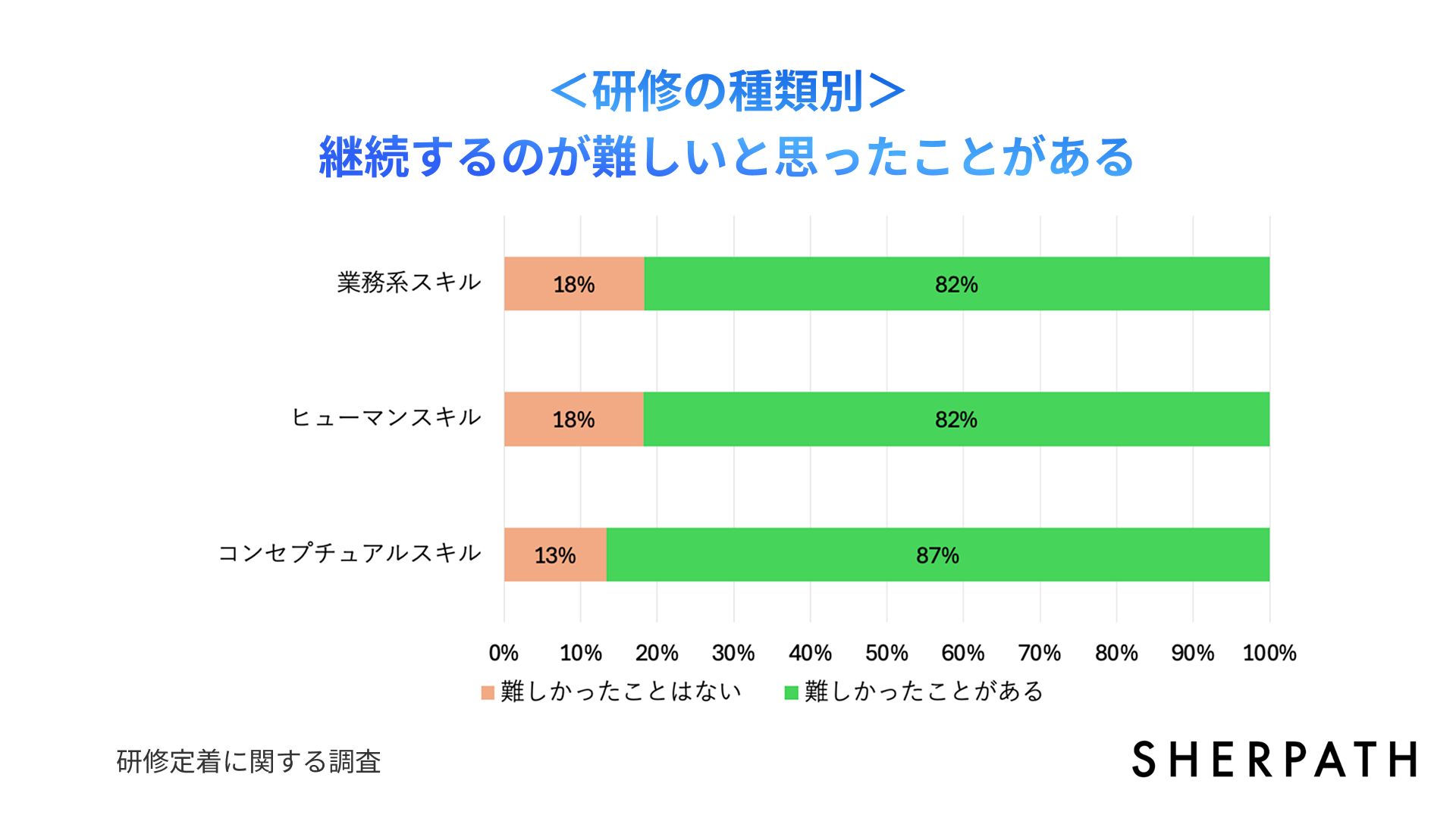 一方で、研修内容を実践するのが難しいと答えたのはすべての研修種別で80%を超え、研修の満足度と相関はないことがわかる。