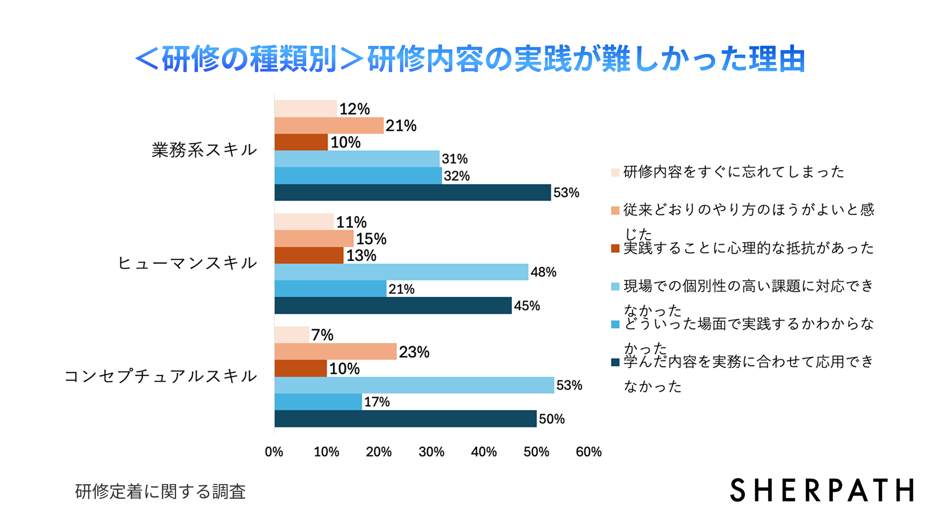 研修の種類別に実践が難しかった理由を見ると、業務系スキルでは「学んだ内容を実務に合わせて応用できなかった」がもっとも多かったのに対して、ヒューマンスキル・コンセプチュアルスキルでは「現場での個別性の高い課題に対応できなかった」が多い結果に。