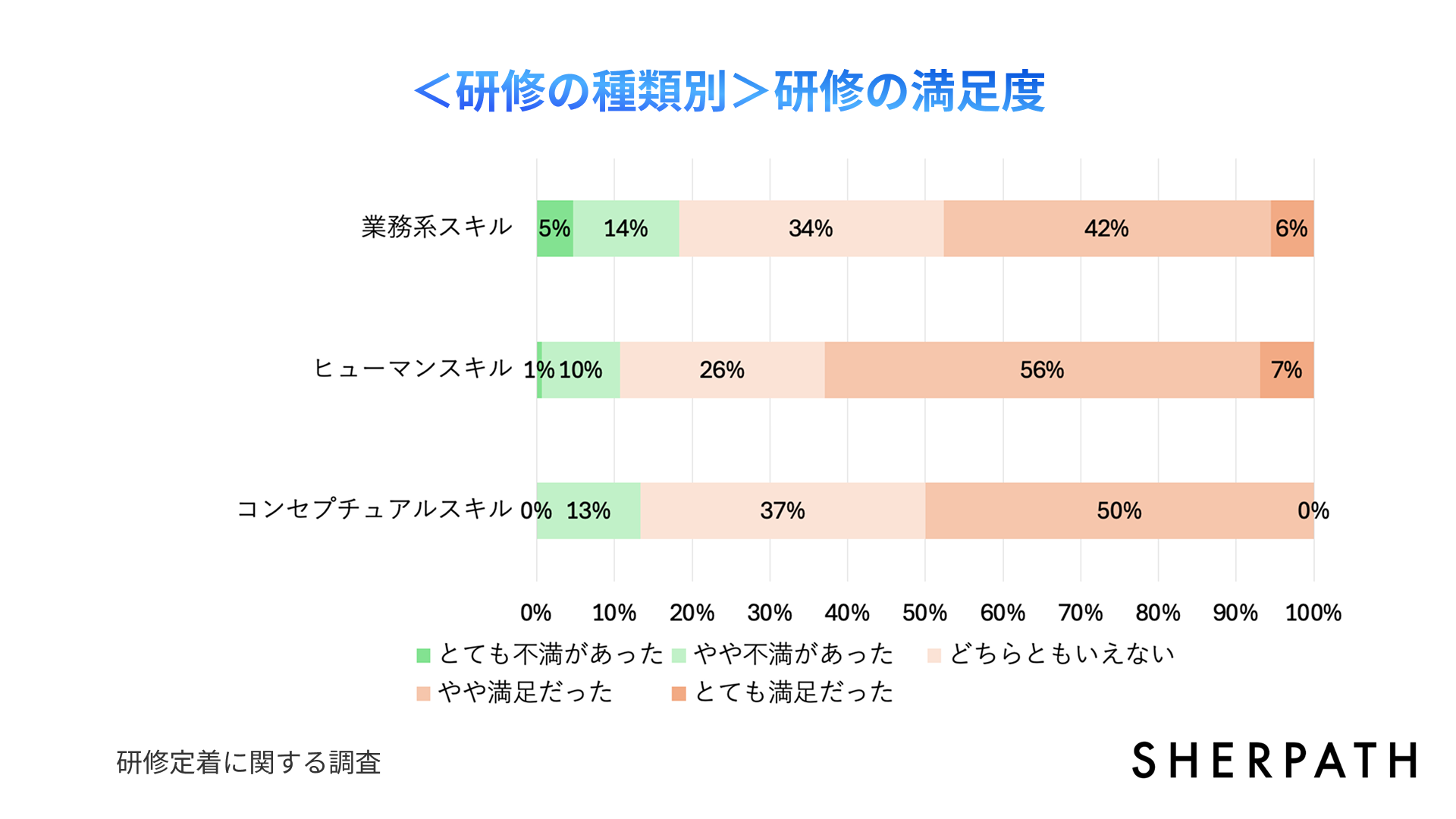 研修自体の満足度はヒューマンスキルが最も高く63%、コンセプチュアルスキルが50%と続く。