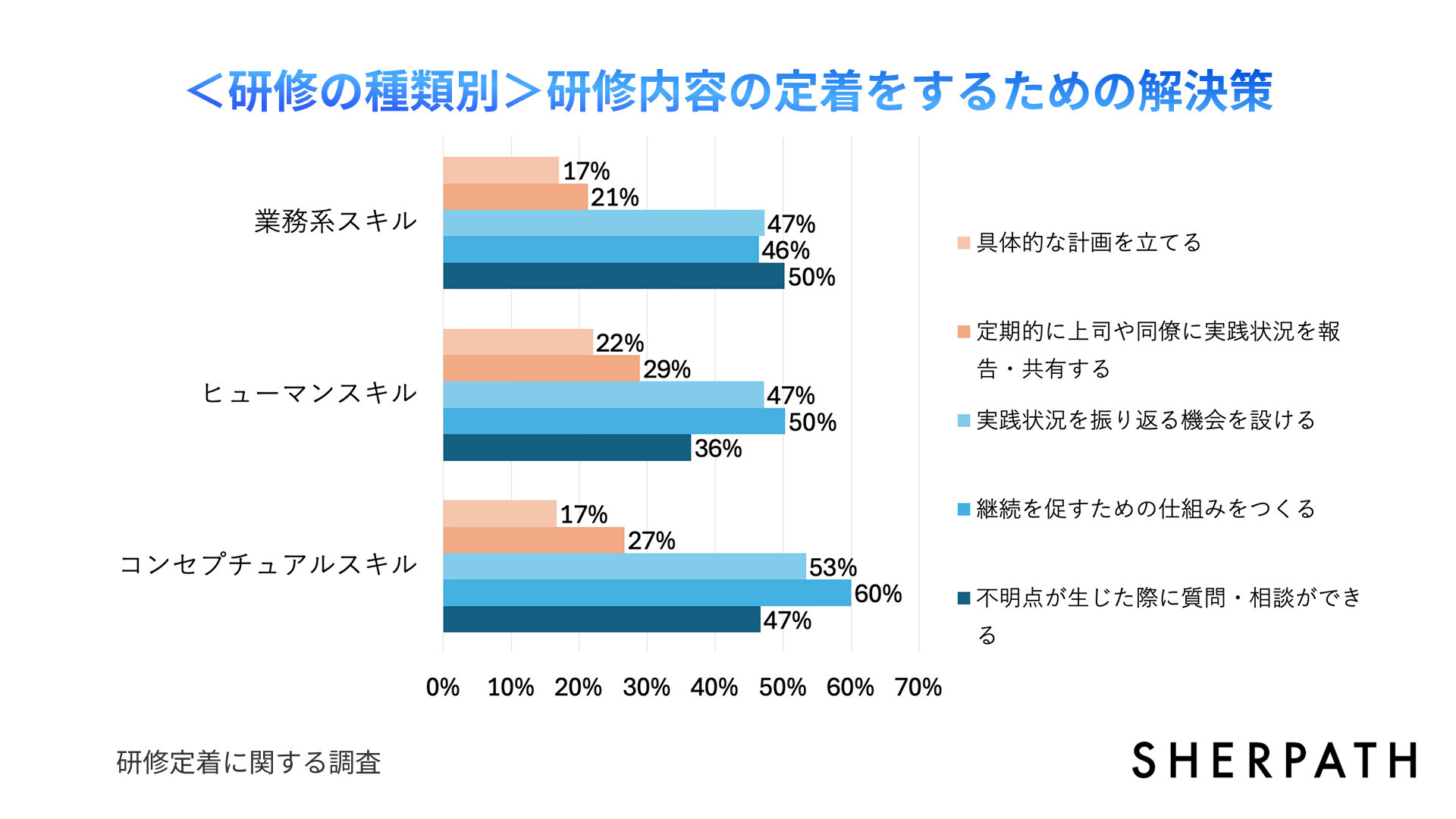 研修内容の定着をするための解決策としては、ヒューマンスキル・コンセプチュアルスキルで「定着を促すための仕組みをつくる」「実践状況を振り返る機会を設ける」が多く、継続的に実践を支援、促進する仕組みづくりづくりが重要だと感じている受講者が多いことがわかる。