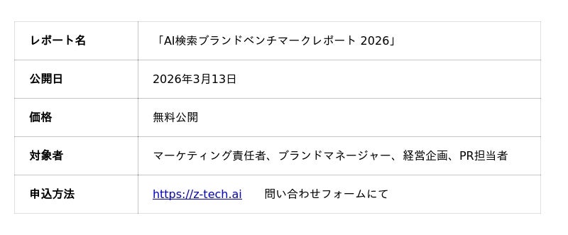 [表: https://prtimes.jp/data/corp/172653/table/6_1_c8b98d69e382eebf2bdc78d276714785.jpg?v=202603130515 ]Z-GEO AI Monitor(TM)について