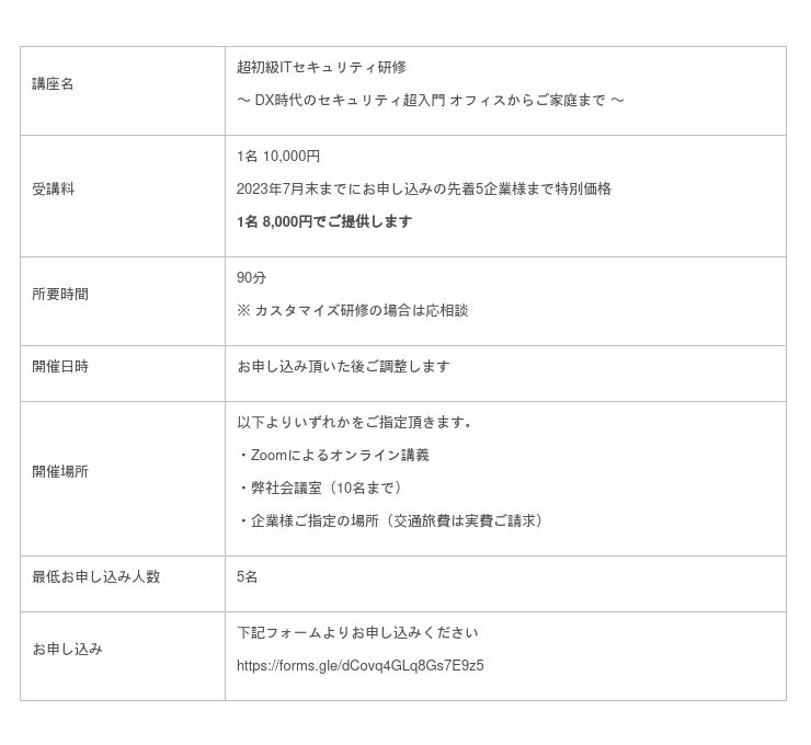 Fullon株式会社では2023年7月1日より、非IT系中小企業を対象とした「超初級ITセキュリティ講座」開講記念キャンペーンを開始しました。2023年7月31日(月)までにお申し込みの先着5社まで、1名あたり講座受講料20%オフの開講記念キャンペーン価格でご提供します!
