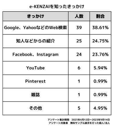 2023年4月12日〜2023年9月14日に自社で行った購入前顧客へのアンケート結果によると、無料サンプル請求を行った方のうち約6%の方がYouTubeでe-KENZAIを認知し、無料サンプル請求へ繋がったことがわかった。
