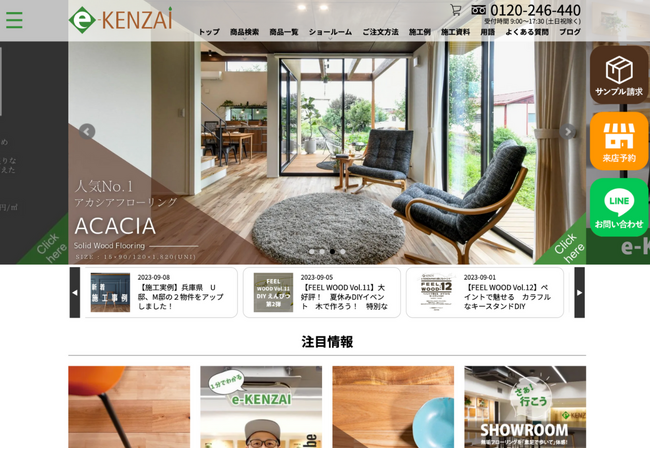e-KENZAIは無垢フローリング(以下、無垢床)を中心に約70種類以上の厳選されたアイテムを揃えたネットショップです。ベトナムや中国へ代表自らが足を運び信頼できる工場を開拓して製造された製品はどれも高品質。メーカーが直接販売することで、これまで「無垢床は高価」と思われていた印象とは逆に、手頃な価格で高品質でおしゃれな床材を提供しています。