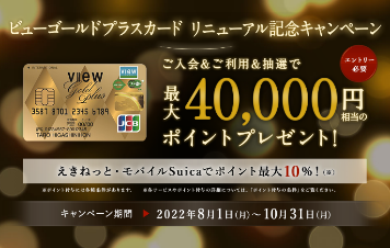 本リニューアルを記念して、2022年8月1日〜2022年10月31日の期間にて、最大40,000円相当のポイントがもらえる、「ビューゴールドプラスカード リニューアル記念キャンペーン」を実施予定です。