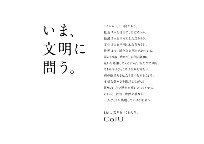 「CoIU(Co-Innovation University)」のレター(文字列)は、セリフレスローマン体といわれる伝統と現代がかけ合わさった書体の考え方をもとに、伝統的な美しさと、軽やかで明快な印象を兼備した表現としました。