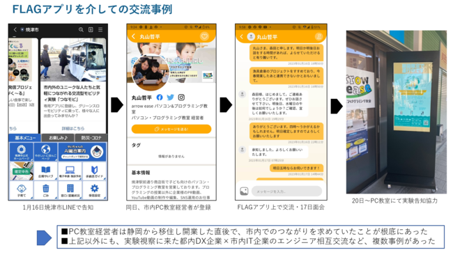 ビジネスマッチングアプリ「FLAG」により、各ユーザーの属性を可視化したプロフィール情報と位置情報を活用することで、来街者や地域住民などの交流を促進。地域の人材交流をハイブリッド化し、関係人口増加に繋げている。東京・大手町のほか、大阪、愛媛での運用実績あり。 以 上