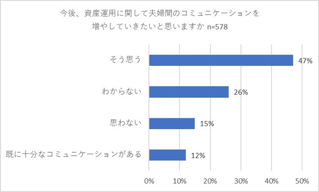 最後に「今後、資産運用に関して夫婦間のコミュニケーションを増やしていきたいと思いますか」と質問しました。結果は「そう思う」が47パーセントで最多。以下、「わからない」(26パーセント)、「思わない」(15パーセント)、「既に十分なコミュニケーションがある」(12パーセント)が続きました。資産運用に関する夫婦間のコミュニケーションの多さは世帯によりバラつきがありますが、少なくともコミュニケーションを増やすことに対する妻側の意欲は高いものがあると言えそうです。