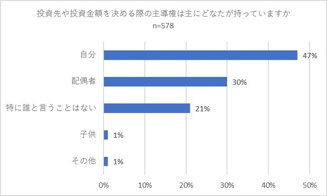 それでは資産運用の実権は誰が握っているのでしょうか。「投資先や投資金額を決める際の主導権は主にどなたが持っていますか」と質問したところ、「自分」(妻)との回答が47パーセントで最多となりました。次いで「配偶者」(夫)が30パーセント、「特に誰と言うことはない」が21パーセントで続きました。約5割の世帯で妻が資産運用の主導権を持っているということは、妻が「財布のひもを握っている」という一般的イメージと符号していると言っても良いかもしれません。