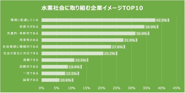 ・イメージ上位は「環境に配慮している(42.5%)」「技術力がある(38.9%)」「先進的・革新的である(35.9%)」で水素社会実現に取組む企業に対して総じてポジティブなイメージ。