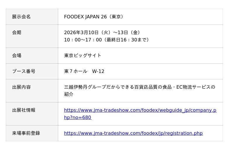 株式会社三越伊勢丹ビジネス・サポート(以下、当社)は、2026年3月10日(火)〜13日(金)に東京ビッグサイトで開催される食品業界向け展示会「FOODEX JAPAN 26(東京)」に出展いたします