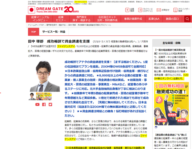 ファイナンスアイは、「1社でも多くの企業にファイナンスという活力を。継続的に成長していく支援をする事で、日本経済に貢献。」を理念に、起業家・個人事業主・中小企業の経営者に対し、成功報酬型で資金調達を支援しています。厳しい状況にある経営者にも積極的なサポートを行い、支援先はコロナ禍にも負けず高い生存率を誇ります。ゼロゼロ融資による中小企業の倒産増加が顕在化してきた今、日本全国の経営者から毎日届く資金の悩み相談に対応し続けています。運営するWEBのオウンドメディアや各種SNSやLINE公式アカウントを通じて、大手金融機関出身者や財務コンサルタント、M&A支援機関のメンバーが監修した有益で視聴者や読者に分かりやすい情報を発信し続けています。サイトでは、融資が実現できる可能性を無料で診断するコンテンツも提供しており、毎日多くの経営者様にご利用頂いています。ファイナンスアイでは資金調達だけではなく、経営者の様々な相談にも応じています。経済産業省中小企業庁のM&A支援機関登録制度にも登録済で、小規模事業承継などによるM&Aの支援もしており、企業再生や経営改善といった困難な状況下で多くの経営者を支援してきた経験と知識を活かし、生存し続ける未来志向のサポートを提供しています。今回、日本最大級の起業支援プラットフォームであるドリームゲートの認定アドバイザーとしても活動を開始した事で、今後もファイナンスの支援を通じて皆さまの事業の維持・発展の支援を通じて、スタートアップの創出と育成、地方創生と日本経済の発展に寄与してまいります。