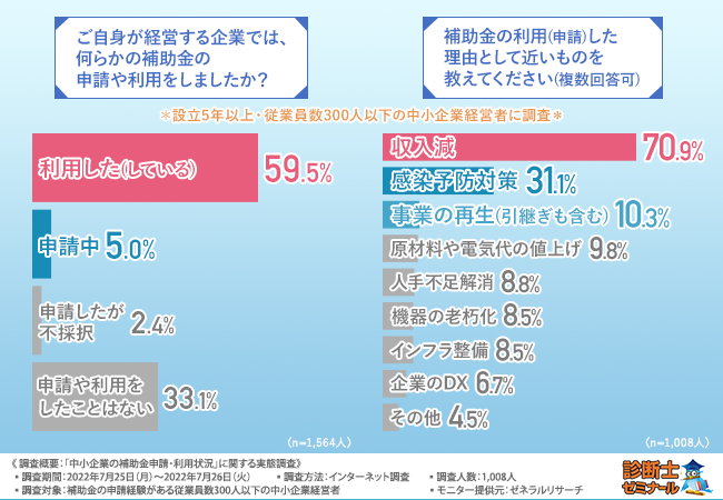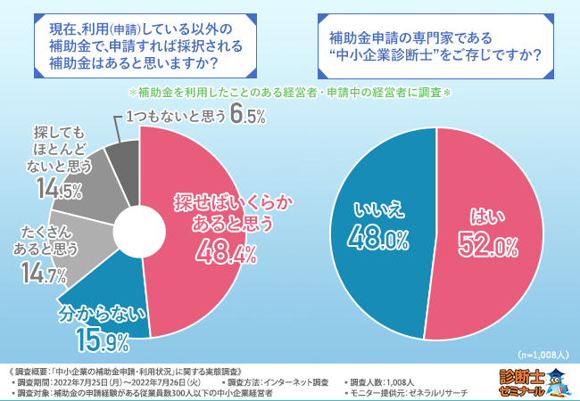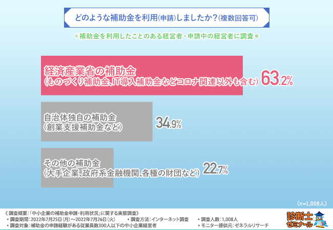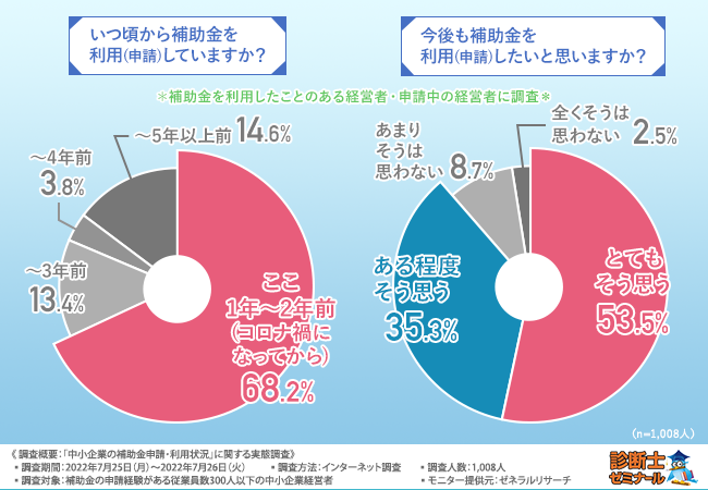 中小企業診断士合格講座『診断士ゼミナール』を運営する株式会社レボ(本社所在地:東京都港区、代表取締役:松永 慎也)は、設立5年以上の中小企業(従業員数300人以下)の経営者にアンケートを実施し、何かしらの補助金を申請・利用した経験のある経営者1,008人を対象に、「中小企業の補助金申請・利用状況」に関する実態調査を実施しました。