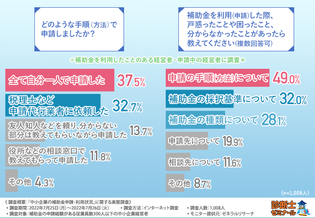 しかし、補助金申請に戸惑うという方も少なくはなく、また、数多く存在する補助金制度を十分に活用しきれていない可能性もあることも分かりました。