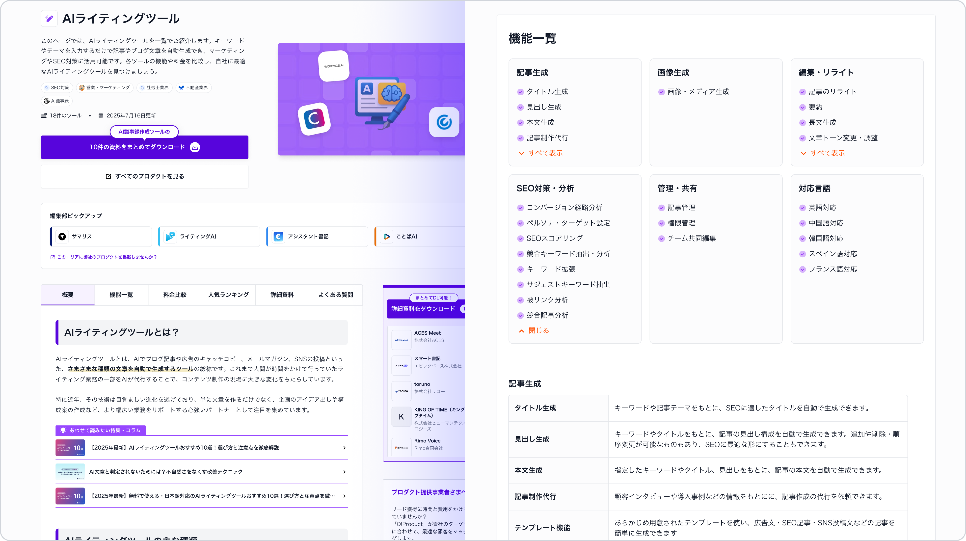 [画像6: https://prcdn.freetls.fastly.net/release_image/57106/10/57106-10-9a38412adf0931ef95e481f4dab9497d-3900x2184.png?width=536&quality=85%2C75&format=jpeg&auto=webp&fit=bounds&bg-color=fff ]「AIライティングツール」や「AI議事録ツール」といったカテゴリごとに、専門性の高い情報を集約。各カテゴリページでは、「そもそもどのようなツールなのか?」という基本解説から、ツールの種類や選び方のポイントまでを網羅し、ユーザーの知識レベルを引き上げながらツール選定をナビゲートします。