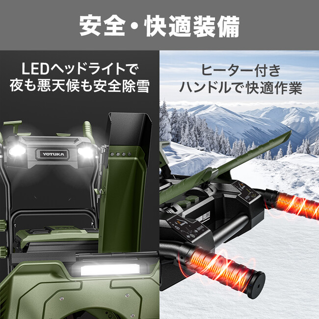 LEDヘッドライトで夜も悪天候も安全に除雪ができます。また、ヒーター付きハンドルなので寒い日にも快適に作業ができます。