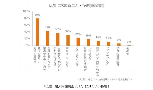 「仏壇に求めること・役割」を尋ねた調査において、回答者658名のうち80%が「故人を偲び、対話する場所」と回答しており、多くの人が仏壇を故人とコミュニケーションをとる場としてとらえていることが分かります。