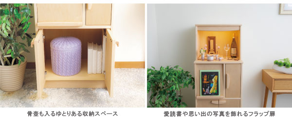 本体下部の収納スペースは骨壺もそのまま納めることができるほどの十分な余裕があるほか、正面に設置したフラップ扉には、故人の思い出の品に限らず、家族の愛用品を置くなど供養にとらわれない使い方が可能ですので、継承の点でも気兼ねする必要がありません。