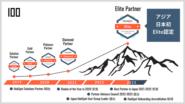 株式会社100は、「半歩先をてらす」をミッションに、2018年に創業し、2019年6月よりHubSpotの専門家・エキスパート集団として活動を開始して、2022年、HubSpot国内トップパートナーとして「HubSpot Best Partner in Japan」を2年連続で受賞しています。2023年7月にはHubSpot Onboarding Accreditation を取得し、同年8月、アジア初のHubSpot社のSolutions Partnerプログラムにおいて活動する企業の1%以下という狭き門のHubSpot Elite Partnerの基準をクリアし認定されるなど、アジア諸国No.1のHubSpotパートナー企業です。HubSpotを活用したRevOps(レベニューオペレーション)を軸に、SMBからエンタープライズまで幅広い企業のビジネスプロセスを可視化し効率化することで、ビジネス成長や収益向上を実現しています。