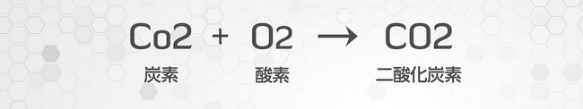 炭の主な成分は炭素(元素記号=C)。そこに空気を送り込み、空気中の酸素(元素記号=O2)と熱を与えて燃えると、炭の表面で炭素の酸化反応がおこり、二酸化炭素(元素記号=CO2)が発生します。