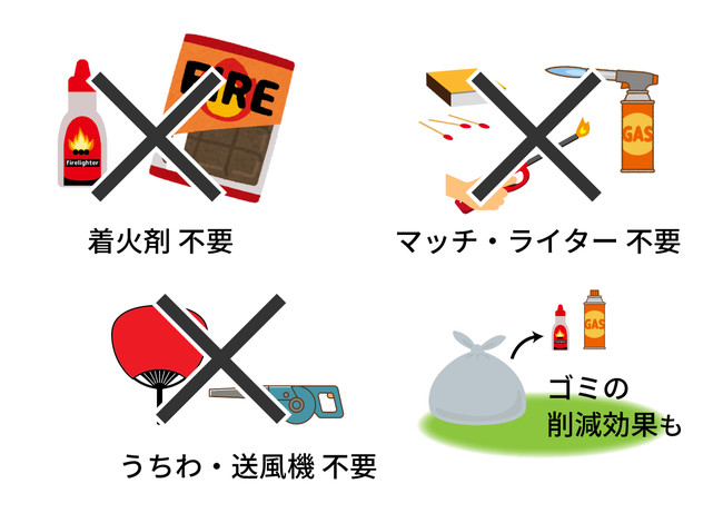 着火剤やガス缶が不要になり、買い忘れの心配がありません。また、ゴミの削減効果も。