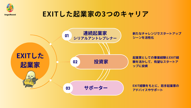 1つ目は、シリアルアントレプレナー。EXIT経験を活かして、新たなチャレンジに挑戦することで、スタートアップシーンを活性化することができはずです。