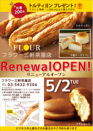【Instagram】 https://www.instagram.com/flour_sancha/■フラワー三軒茶屋店住所: 〒154-0024 東京都世田谷区三軒茶屋2丁目13-11 エコー仲見世内電話番号:03-5432-9306 E-mail:flour.sancha@gmail.com営業時間:11:00~19:00 ※日曜日は18:00close定休日:水曜日 ※5月3日(水)は営業します