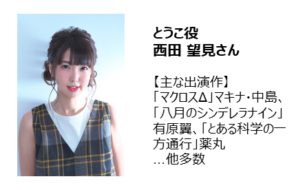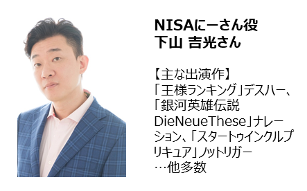 ”NISAにーさん”と”とうこ”の声は、多数のアニメーション作品やゲーム作品などに出演実績のある声優の下山吉光さんと西田望見さんにご担当いただきました。