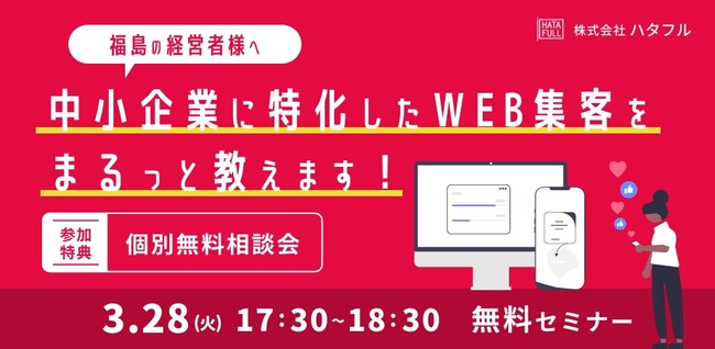 Web制作やデジタルマーケティングを手がける株式会社ハタフル(本社:福島県郡山市、代表取締役:臼井翼)は、『中小企業に特化したWEB集客』をテーマにしたセミナーを3月28日(火)に開催いたします。(申し込み先:https://hatafullseminar230328.peatix.com)