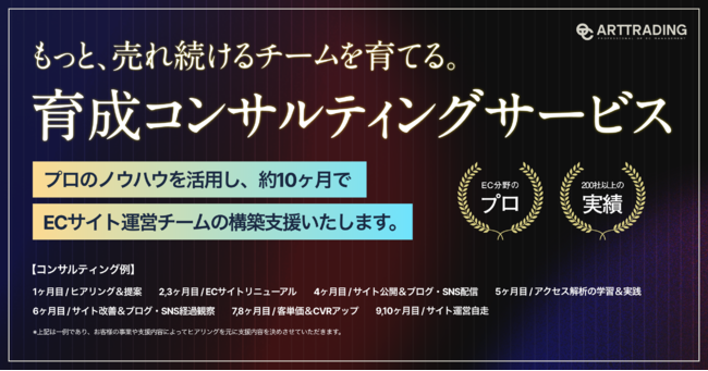 アートトレーディング株式会社(本社:東京都港区、代表取締役:藤井 玲)は、お客様と二人三脚で売れ続けるEC サイトの仕組み作りとチームを育て支援する新サービス「育成コンサルティングサービス」を本日 2022 年 9 月 6 日 (火)より提供を開始いたしました。