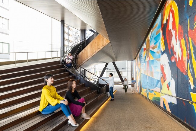 9層のウォールアートは、おりづるタワー東側らせん状スロープ“散歩坂“の1階から屋上展望台まで歩いて上り下りができるオープンエアの開放的なエリアに設置されています。吹き抜ける風を感じながら、中四国最大の都市として復興を遂げた広島の街並みとともにウォールアートを鑑賞できます。