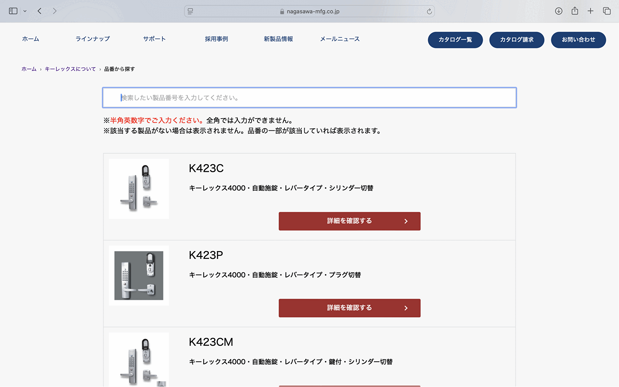 品番を入力するだけでキーレックスを検索し、製品が掲載してあるページにダイレクトにアクセスができます。